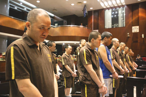 ????上午9時許,庭審正式開始,伍志堅及其團(tuán)伙成員穿著褐色和藍(lán)色的監(jiān)服次第入場。緩步而入的伍志堅身高約170厘米,身材魁梧,面色白凈。他身穿一件褐色監(jiān)服,上有黃色條紋,背后寫著“荔看”二字。他沖著旁聽席上掃視了一眼,兇悍的目光沒有停留。此后法官主持庭審和公訴機關(guān)宣讀起訴書的過程中,他一直低著頭,偶爾向旁邊的武警看一眼,目露兇光。