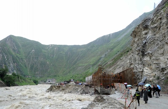 ????6月8日,四川茂縣南新鎮(zhèn)境內(nèi)寬30米、長(zhǎng)100米的保通便道被沖毀后,國(guó)道213線完全中斷。新華社記者 陳凱攝 ????連日強(qiáng)降雨致使四川阿壩州茂縣岷江河水位不斷上漲,7號(hào)晚上,213國(guó)道茂縣段一段路基被洪水沖毀,這一路段徹底中斷,這已經(jīng)是這條有著“震中生命線”之稱的國(guó)道,在近期內(nèi)的第二次中斷。 ????受上游強(qiáng)降雨影響,7號(hào)深夜23多,國(guó)道213線茂縣南新鎮(zhèn)段公路被洪水沖毀約100米,道路中斷,一名正在駕駛摩托車的人員失蹤。事故發(fā)生后,當(dāng)?shù)卣⒓窗才湃藛T搶險(xiǎn)救人,轉(zhuǎn)移周邊學(xué)校師生。目前,國(guó)道213線茂縣段已實(shí)施緊急管制,車輛和人員均被限行。 ????2010年6月8日早晨,國(guó)道213線汶川老虎嘴路段也出現(xiàn)三處坍塌路面,其中較大的一塊約70米,深約10米。由于三分之二寬的路面已經(jīng)不能通行,交通出現(xiàn)了擁堵,交警部門正在全力疏導(dǎo),路政部門也在加緊搶修道路。 |