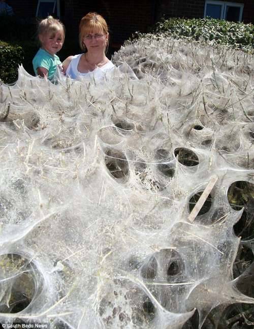 英國婦人茱莉抱著女兒,看到自家花園灌木被厚厚的網(wǎng)覆蓋,覺得驚訝又無奈。 ????中新網(wǎng)6月9日電 據(jù)臺(tái)灣“今日新聞網(wǎng)”8日?qǐng)?bào)道,這不是恐怖片的場(chǎng)景,卻有恐怖片的效果──英國最近出現(xiàn)數(shù)以萬計(jì)的“蠕蟲”編織又黏又厚的怪異蟲網(wǎng),它們多半出現(xiàn)在灌木叢、路標(biāo)下和民宅花園的籬笆,研究人員指出,這些怪網(wǎng)是巢蛾為(ermine yponomeuta moths)化蛹而準(zhǔn)備。 ????蠕蟲通常把網(wǎng)織在喜愛的食物周邊,例如櫻桃樹、山楂等,然后在網(wǎng)巢里吃掉樹葉,還能保護(hù)蟲子遭受鳥和黃蜂的侵襲,直到它們變成蛾。昆蟲專家斯Stuart Hine指出,其實(shí)這種網(wǎng)在英國很常見,通常它們每年7、8月織網(wǎng),一年只這么一次。 |