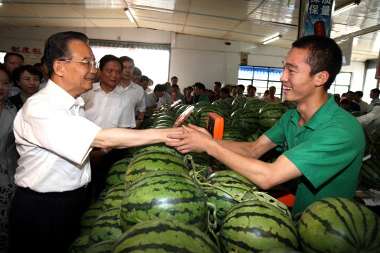 溫家寶在北京市西城區(qū)富國里菜市場(chǎng)了解蔬菜瓜果供應(yīng)和價(jià)格情況(新華社記者 姚大偉 攝)