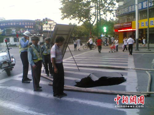 ????記者在現(xiàn)場看到,大坑出現(xiàn)在南京長樂路與箍桶巷的交界處,是南京鬧市區(qū)主干道,每日人流、車流十分密集。據(jù)交警三大隊保安韓金林介紹,當(dāng)時他正在該路段執(zhí)勤,突然“轟隆”一聲,地面就塌陷了一個大坑,他趕緊找來幾根長竹竿圍擋,防止人車陷坑。在場三大隊交警胡博告訴記者,他還是第一次在南京遇到“天坑”。