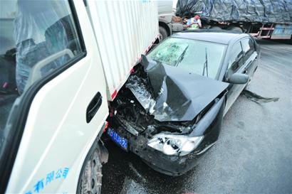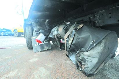 ????記者看到車禍現(xiàn)場(chǎng)西側(cè)是一片工地,路口交通信號(hào)燈一直黃燈閃爍示警,不時(shí)有車輛從工地方向駛出,從馬路中間隔離墩豁口橫過馬路。一輛白色的廂式貨車就橫在馬路中間的隔離墩豁口處,車身左側(cè)的油箱被撞破,一輛黑色比亞迪轎車車頭頂在廂式貨車車身中部,車前蓋蹺起,車頭被撞凹陷,駕駛室內(nèi)仍然能看到斑斑血跡,車內(nèi)傷者已經(jīng)被120救護(hù)車緊急送往海慈醫(yī)院急救。交警隨后趕到現(xiàn)場(chǎng),將兩輛肇事車拖走。