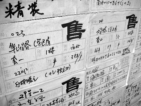 大學(xué)路上一家房產(chǎn)中介在墻上掛出很多學(xué)區(qū)房房源招攬顧客(宋珊珊 攝)