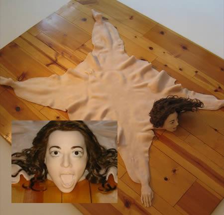 ????Chrissy Conant運(yùn)用一些材料,根據(jù)個(gè)人特征,把自己做成一塊地毯放在木地板上,嘴張開,眼睛看著上方。據(jù)作者Chrissy說她的這個(gè)作品表達(dá)了父母在去世后對(duì)長大的她的影響和壓抑。