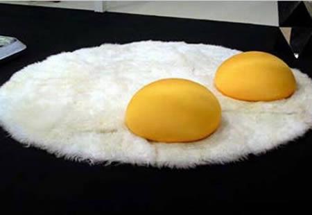 ????雞蛋敲碎以后自然分成蛋黃和蛋白。藝術(shù)家根據(jù)雞蛋的物理特征,制成了雞蛋地毯。兩個(gè)用革制成的黃色抱枕可以充當(dāng)雞蛋的蛋黃,而白色的地毯與黃色的抱枕融合在一起給人一種假象。想象一下,躺在地毯上,靠著抱枕看電視是多么舒服愜意的一件事?。?/p>