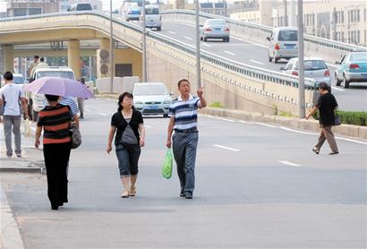 ????“大娘,您要過(guò)馬路的話,請(qǐng)走那邊的過(guò)街天橋好嗎?上面有電梯,走起來(lái)很方便的?!弊蛱焐衔?0時(shí),記者在威海路與臺(tái)東三路路口附近看到,在路口執(zhí)勤的交警正在勸阻一位拄著拐杖老人不要冒險(xiǎn)橫穿馬路?!拔揖偷今R路對(duì)面的那家商店買點(diǎn)東西,很快就過(guò)去了,不用繞那么遠(yuǎn),我年紀(jì)大了,走天橋又不方便?!边@位大娘一開(kāi)始望了望50米外的過(guò)街天橋,還是希望能夠穿過(guò)幾米寬的馬路到對(duì)面去?!耙晃易o(hù)送您走天橋吧!”聽(tīng)到交警這樣提議,這位老大娘急忙擺了擺手,自己朝過(guò)街天橋走過(guò)去。