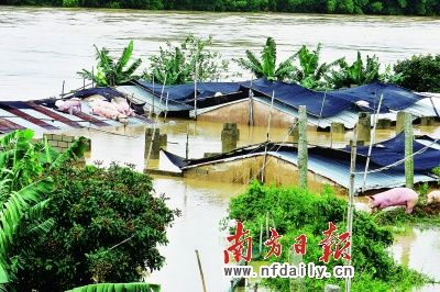 惠來縣邦山村有的地方水深達(dá)到兩三米,被困人員已被轉(zhuǎn)移安置,剩下一些豬只爬上屋頂避災(zāi)(南方日報(bào)記者 梁文祥 攝)