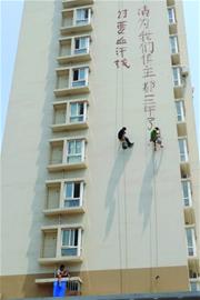 ????昨日上午8時許,市民丁先生出門上班,當(dāng)走到鞍山一路與嘉定路路口時,看見兩個“蜘蛛人”正掛在30多米高的樓外墻上,可讓丁先生奇怪的是,這兩名男子不是在刷墻,而是用刷子蘸著紅色涂料在墻上寫字。記者在現(xiàn)場看到,兩名小伙子腰間各自拴著一根繩子,懸掛在10樓的西側(cè),身邊各掛著一個小涂料桶,墻上寫了兩排紅色大字。記者注意到,樓下還有十幾名工人在助陣,3樓平臺上的一名男子不時爬上爬下給半空中的兩人傳遞消息。