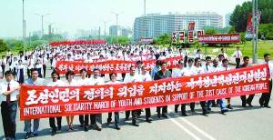 25日,正在朝鮮參加國際青年大會的外國青年學生在平壤舉行聲援朝鮮人民正義斗爭的游行。