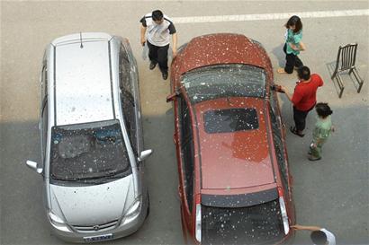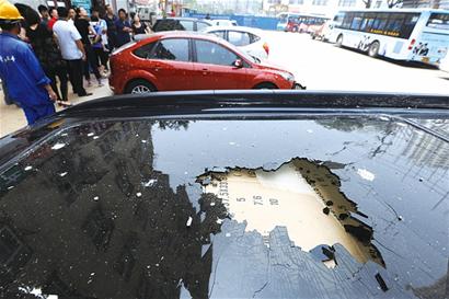 ????記者在現(xiàn)場看到,停在鄆城北路西側的一排汽車上都散落著水泥點子,其中一名越野車的女車主正心疼地擦拭著車身,她告訴記者,半空中掉落的石子砸壞了越野車的后車燈,還把天窗砸了個大窟窿。“我買這車花了14萬元,剛開了兩個半月,有3塊車玻璃被砸碎,車頂也被砸得凹陷,就是修好了也變成舊車了?!痹揭败嚺赃叺募t色福特轎車司機郁悶地說。