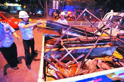 ????“東山二路的那個攤販剛才沒出攤,現(xiàn)在再過去看看?!睆堦犻L告訴記者,東山小區(qū)旁邊的占路攤販擾民嚴(yán)重,居民多次舉報,當(dāng)天傍晚7點左右執(zhí)法人員曾來查處,但這個攤主沒出攤。當(dāng)執(zhí)法人員再次來到東山二路拐角時,這里的買賣正“紅紅火火”:擺攤的兩口子一起在爐子前烤肉,濃煙升起七八米高?!罢骟@了,你們怎么一會就來了兩次?!睌傊饕姷綀?zhí)法人員直搖頭?!澳銈兙筒粦?yīng)該在這里干,大夏天的讓我們怎么開窗。”一名小區(qū)居民見執(zhí)法人員收繳攤主烤肉爐子,終于出了一口氣。