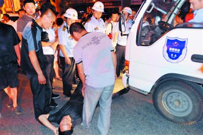 ????執(zhí)法車輛沿書院路向西巡查時,在靠近少山路路口處發(fā)現(xiàn)一個占路經(jīng)營的燒烤攤位。燒烤攤主將10多個餐桌全部擺放在人行道上,烤肉爐子直接擺到了車行道上。當(dāng)執(zhí)法人員上前將攤主的烤肉爐子收繳時,一名40多歲的男子居然跑到執(zhí)法車前躺倒地上,不讓執(zhí)法車離開?!澳銈儾贿€我爐子,就別想離開!”這名男攤主開始還坐在執(zhí)法車前方,后來索性躺在左前輪前,阻礙執(zhí)法車?yán)^續(xù)執(zhí)法?!翱焖懔税桑闾稍谶@里好看?”在執(zhí)法人員勸說的間隙,兩名男攤主的朋友跑過來,將攤主拉起來,邊勸邊將其拖離車行道。 記者 趙健鵬 攝影報道