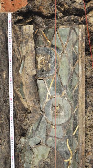 ????而玉棺的發(fā)現(xiàn)更為驚人,現(xiàn)場已發(fā)現(xiàn)玉棺的一面?zhèn)劝逑鄬ν暾牡顾樾?,?cè)板上鑲嵌有大量菱形玉片,中間則用刻有紋飾的玉壁填充,而在玉片之間的連接處均用金箔條和銀箔條進(jìn)行貼邊鑲嵌,玉壁上則用銀片進(jìn)行粘貼,外表上金光、銀光、玉光交織在一起,分外鮮明。在棺木上,細(xì)細(xì)查看,不難看出一些閃亮的紋飾,“這座棺木是金鑲玉的,十分罕見。目前,只有河北滿城漢墓和徐州獅子山楚王陵出土過?!?/p>