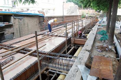????最值得一提的是,位于小院內(nèi)最東邊的一條臭水溝開始改造?!斑@條溝很多年了,滿是污水,基本沒人敢靠近,最要命的是夏天,蚊子、蒼蠅滿天飛,根本沒法開窗?!奔易V饒路32號(hào)樓的張福堂大爺告訴記者。記者看到,臭水溝明渠已被覆蓋,變?yōu)榘登?,施工人員正在做箱梁加固處理,“覆蓋箱梁處理完后,就可以進(jìn)行硬化了,辟出一塊籃球場地和一塊羽毛球場地,然后再安上一些小型健身器材,方便居民活動(dòng)。”施工人員說。