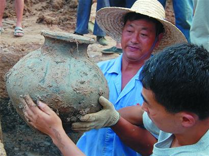 ????這處墓穴還出土了兩件黑色陶罐,其中一件只剩下碎片,而另一件保存完整。“發(fā)現(xiàn)時,破碎的陶罐是倒扣在坑中,另一個是斜豎著的,不知道這是否與當(dāng)時的習(xí)俗有關(guān)?!惫ぷ魅藛T說,陶罐口直徑20厘米,高30厘米。此外,陪葬坑中兩塊發(fā)黑的泥土也引起考古人員的興趣。“我們判斷這是腐爛的木制梳子,而且是兩把,一把梳齒的間隙密一些,另一把稀疏一些。發(fā)現(xiàn)梳子不代表墓主人是女人,漢代男人頭發(fā)也長,用梳子梳頭是很正常的事?!笨脊湃藛T說,由于尸體嚴(yán)重腐爛,不能斷定墓主人的性別,但有一點(diǎn)可以肯定,這些陪葬品對于研究當(dāng)時居民的生活習(xí)俗有一定價值。 (記者 王濤 攝影報道)