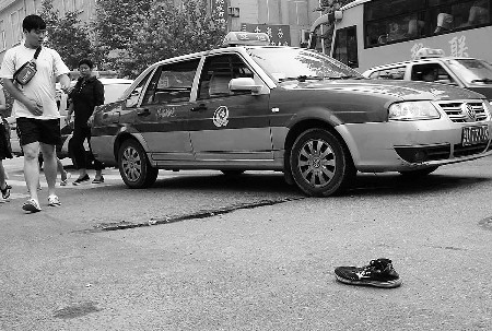 ????22日下午4點(diǎn)半左右,記者接到熱線,華陽(yáng)路一輛出租車把行人撞飛。記者迅速趕到現(xiàn)場(chǎng),發(fā)現(xiàn)肇事出租車停在路邊,車燈閃爍,110警車停在旁邊。記者看到,出租車車頭右前方還帶著斑斑血跡,車右前方路面上有一攤巴掌大的血已經(jīng)干掉。出租車后面的斑馬線上有一米半左右的剎車痕跡。在出租車前方5米開外,記者發(fā)現(xiàn)了一只黑色鞋子,后來(lái)鞋子被市民踢到出租車附近。