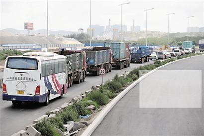 ????昨天中午12時(shí)15分,記者沿環(huán)灣大道返回市區(qū),行至距離新雙埠收費(fèi)站1公里、雙埠立交橋下路段時(shí),此處道路彎彎曲曲,大貨車(chē)及大巴車(chē)經(jīng)行此處時(shí)均小心翼翼,車(chē)速非常緩慢,不一會(huì)便聚集了大量車(chē)流。