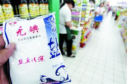 ????該處貨柜上還有一大排是專賣無碘鹽的,每袋500克,上面標(biāo)注著“無碘專供甲亢患者食用”的字樣,價(jià)格跟同量的精制鹽是一樣的,都是1.5元錢。記者在現(xiàn)場(chǎng)注意到,很多市民對(duì)于該用什么樣的食鹽犯起了糊涂,一位中年婦女在專柜前先拿了包精制鹽,又放下,接著換包海藻碘鹽,最終她選擇了一包核黃素碘鹽,該種碘鹽號(hào)稱可以防止碘流失。售貨員告訴記者,其實(shí)還是普通含碘精制鹽賣得比較火,每天大約賣掉七八百袋子,而無碘鹽只能賣40多袋子,“買的主要是些甲亢患者?!庇浾哂众s到青島前海購物廣場(chǎng),在該處調(diào)味品的一處專柜上,記者見到了6種食鹽,除了加碘鹽,也有無碘鹽在銷售。 陳勇 孫啟孟