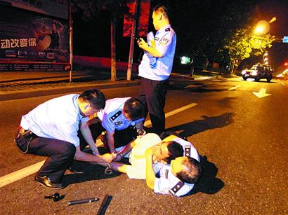 新聞揭秘 擒兇民警都是“高手” 今晨,記者從珠海路派出所了解到,奮不顧身沖上前去抓捕歹徒的民警是該所的馮文國和肖學(xué)兵,還有金門路派出所的民警楚華云和閻魏魏。其中馮文國和肖學(xué)兵曾多次處置此類危險(xiǎn)突發(fā)事件。所在的13號警車也被市公安局授予“利劍之星”稱號。馮文國從事公安工作已經(jīng)十幾年了,是一位“久經(jīng)沙場”的老民警,經(jīng)驗(yàn)非常豐富。肖學(xué)兵則剛從軍隊(duì)轉(zhuǎn)業(yè)到公安一年多,“武功”十分高強(qiáng),擒拿格斗各方面都非常全面。 聽說記者要采訪,兩位民警都有些不好意思。 “當(dāng)時(shí)的情況,無論換成哪個(gè)民警都會沖上去的。 ”當(dāng)記者問道為什么獲得開槍批準(zhǔn)后,仍選擇冒著生命危險(xiǎn)徒手智擒歹徒時(shí),兩人都表示,“雖然面對的是歹徒,但是我們也應(yīng)該盡最大努力,把傷害減少到最低”。 為避免傷害設(shè)計(jì)制伏兇徒 4名民警勸說無效后僅用5秒鐘閃電拿下鬧事者 今晨2時(shí)許,在市南區(qū)天虹花園小區(qū)大門口,一名40歲左右的男子在門口來回轉(zhuǎn)悠,保安老詹走上前盤問。誰料,對方罵了幾句后,突然從包內(nèi)掏出一把菜刀狠狠地朝老詹頭上砍去。老詹下意識用右手一擋,頓時(shí)感到一陣鉆心的疼痛。老詹連忙一邊躲避一邊撥打了110。民警迅速趕到現(xiàn)場,經(jīng)過十幾分鐘的緊張對峙,已經(jīng)獲準(zhǔn)開槍的民警,在緊急關(guān)頭放棄開槍,機(jī)智地將“菜刀男”摁地擒獲。 民警請示可開槍時(shí)間一分一秒地度過,現(xiàn)場陷入僵持狀態(tài)。民警掏出手槍欲逼迫該男子放下手中的菜刀,可他看見手槍后并沒有絲毫收斂的意思,反而欲上前搶奪民警的手槍。民警經(jīng)過商量后,欲采取合圍一舉將其擒獲??伞安说赌小彼坪醴浅V?jǐn)慎,看到4名民警朝其靠攏,情緒立即激動起來,手中的菜刀揮舞得更加起勁。無奈之下,民警只能暫時(shí)放棄強(qiáng)攻。擔(dān)心僵持時(shí)間過久,會造成其他不必要的傷害。民警隨即向市110指揮中心匯報(bào),經(jīng)過請示后,民警獲準(zhǔn)可以開槍擊傷歹徒后,再實(shí)施抓捕。 |
