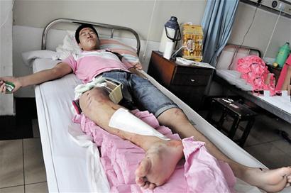 ????昨天上午,記者趕到膠南市人民醫(yī)院7樓病房看到,馬志強正躺在病床上打吊瓶,他的整條右腿腫得非常厲害,被幾塊木板臨時固定著,在他右腿膝關節(jié)部位,有一大塊皮膚已變黑。