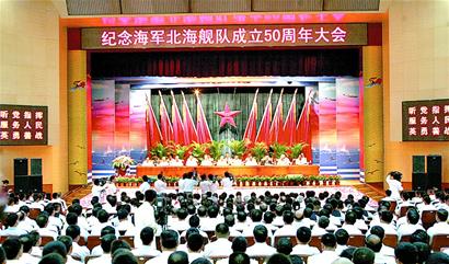 紀(jì)念海軍北海艦隊(duì)成立50周年大會(huì)在青島某軍港碼頭禮堂舉行