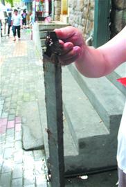 ????“我們懷疑這些支撐門頭的螺絲、角鐵有質(zhì)量問題,很多都已經(jīng)銹斷了,這些門頭一天比一天往下沉,現(xiàn)在比當(dāng)初已經(jīng)沉降了20多厘米了?!苯壬钢T頭背面告訴記者,他懷疑就是因為這些建材質(zhì)量不過關(guān),導(dǎo)致了旁邊5家店的門頭整體沉降。