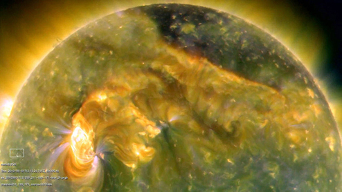 ????8月3日,NASA公布了太陽動(dòng)力學(xué)觀測衛(wèi)星(SDO)1日通過極紫外線相機(jī)拍攝到的太陽北半球有一個(gè)C3級(jí)別的耀斑爆發(fā),并伴有日冕物質(zhì)拋射。