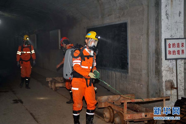??8月7日,在山東招遠玲南礦業(yè)有限責任公司羅山金礦,救援人員在巷道口整理裝備。新華社記者 朱崢攝