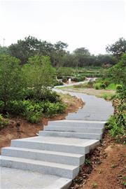 ????根據(jù)規(guī)劃,浮山香苑將建設(shè)總長(zhǎng)為4220米、聯(lián)系各個(gè)景觀區(qū)域的七彩健身路。記者昨在施工現(xiàn)場(chǎng)看到,原本從銀川西路通往山頂?shù)耐谅?,已被柏油行?chē)路、鵝卵石健身路和花崗巖登山小徑所取代。整個(gè)園區(qū)有一條雙向盤(pán)山車(chē)行道,可以互通景區(qū)的兩個(gè)大門(mén);多種彩磚和鵝卵石構(gòu)成的步行道將各個(gè)景觀區(qū)域 “串”了起來(lái);以花崗巖為材質(zhì)的石階路則不規(guī)則地“穿梭”于園區(qū)的各個(gè)角落,市民可以選擇不同的周邊景觀作為登頂路徑。