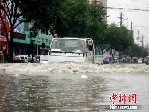 9日下午3時左右,山西運城市上空烏云密布電閃雷鳴,緊接著暴雨傾盆而下,持續(xù)近40分鐘的暴雨讓運城市區(qū)變成一片汪洋。圖為汽車在積水中艱難的行駛。 陳衛(wèi) 攝