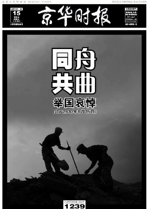 ????記者當(dāng)天上午在北京街頭看到,售報亭臺架上一疊疊報紙的頭版均以黑底白字刊印,滿目悲情?!侗本┏繄蟆奉^版以特大字號寫著“同胞 同悲 同在”,《京華時報》整版寫著幾個大字:“同舟共曲,舉國哀悼,公元2010年8月15日”。