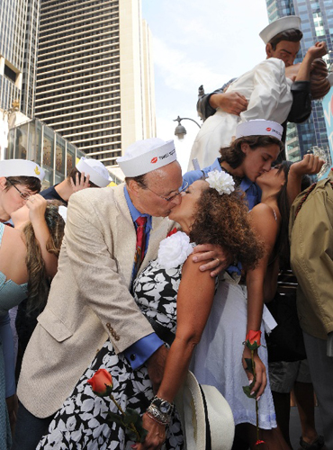 美國(guó)紐約時(shí)報(bào)廣場(chǎng)14日舉行大規(guī)模接吻比賽,再現(xiàn)“勝利日之吻”的經(jīng)典瞬間,并以此紀(jì)念二戰(zhàn)結(jié)束65周年。