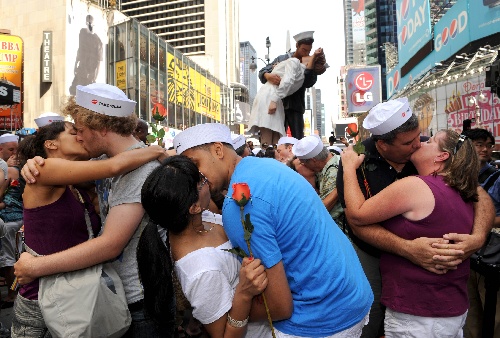 ????來自不同國(guó)家、不同種族、持有不同宗教信仰的200多對(duì)情侶,從上午10時(shí)起陸續(xù)會(huì)集在紐約時(shí)報(bào)廣場(chǎng)。男士戴著主辦方提供的白色水手帽,女士手拿一支玫瑰,盡情擁吻,以他們自己的方式紀(jì)念二戰(zhàn)勝利65周年,也表達(dá)他們對(duì)和平的向往。