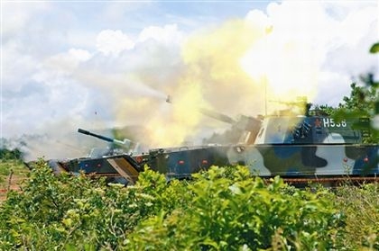 ????“準(zhǔn)備射擊!”3輛戰(zhàn)車(chē)距離岸灘數(shù)百米時(shí),目標(biāo)位置、氣溫、風(fēng)速、氣壓等射擊條件傳入新型兩棲自行火炮的火控計(jì)算機(jī),射擊諸元迅速顯示,炮口自動(dòng)轉(zhuǎn)動(dòng)俯仰。就在戰(zhàn)車(chē)履帶剛剛搶灘上陸的瞬間,6發(fā)炮彈同時(shí)離膛。幾秒鐘后,前方觀察所指示:“目標(biāo)摧毀,迅速轉(zhuǎn)移!”隨即,3輛戰(zhàn)車(chē)快速向海岸叢林轉(zhuǎn)移隱匿。