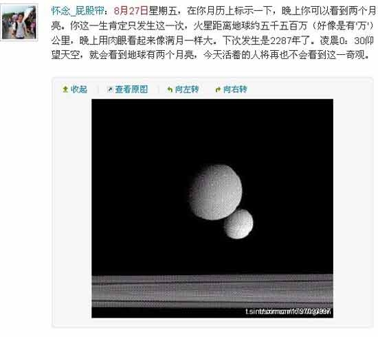 有網(wǎng)友發(fā)帖稱8月27日,天空將出現(xiàn)“兩個(gè)月亮”。
