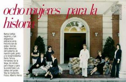 據(jù)《每日電訊報(bào)》報(bào)道,包括一名副首相在內(nèi)的西班牙8位女部長(zhǎng)身穿合體的套裝或休閑裝、擺出不同姿勢(shì)的照片上了2004年的一期《時(shí)尚(Vogue)》封面。這張照片立即在西班牙引起巨大爭(zhēng)議。