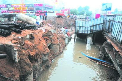 ????記者在地下通道北側入口看到,入口旁邊已被施工人員挖出一個大坑,坑內(nèi)滿是污水,大坑與地下通道北側入口間只有一些捆扎起來的鐵板圍擋,大水從圍擋縫隙向地下通道內(nèi)涌入。大坑一側停著一輛挖掘機,旁邊還有一根斷裂的管道。商鋪老板們告訴記者,這段管道好像7月份就挖壞了,一直沒有修理,這次發(fā)大水可能與被挖壞的管道有關。
