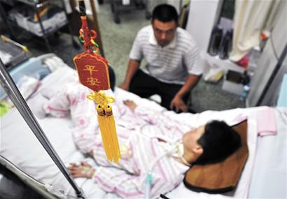 ????前天下午,記者與盛曉一起來到青醫(yī)附院,盛曉除了每天中午、晚上店里需要人手之外,都來陪妻子。記者了解到,盛曉的妻子發(fā)病近一年,四肢的肌肉已經(jīng)萎縮,盛曉每天都要幫妻子把腿支起來,活動(dòng)一下肌肉。在妻子的病床前,盛曉給她掛上一個(gè)紅色平安符,在一片素色的病房?jī)?nèi),特別醒目,這個(gè)小小平安符上,凝結(jié)了他們?nèi)胰说男脑浮?/p>