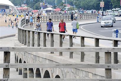 ????“當(dāng)初下海救人的英雄葛路犧牲后,也不知道哪個部門在前海一線設(shè)置了一些救生圈和救生繩,靠著這些救生圈和救生繩,確實救上來過一些落水游客,但后來過了沒多久,這些救生設(shè)施今天丟一個,明天丟一雙,很快就沒了蹤影?!庇浾哐刂_吚^續(xù)前行,一路經(jīng)過棧橋、魯迅公園和木棧道都沒有在海邊欄桿上看到救生設(shè)施,站在東海西路海邊葛路紀念碑旁邊,附近居民趙先生一臉沉重地告訴記者,葛路紀念碑旁邊的兩個救生圈可能是丟得最晚的兩個,一直到前年還綁在葛路紀念碑旁邊的欄桿上,后來可能是捆綁救生圈的繩索被海水侵蝕了,刮臺風(fēng)時救生圈被大浪卷走了。