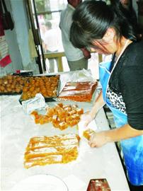 ????昨天下午,記者隨執(zhí)法隊員來到中山街,有消費者舉報這里有幾個加工點存在食品衛(wèi)生隱患。記者隨執(zhí)法隊員走進一家加工點,里面光線較暗,兩名中年婦女一名正在和面,另一名則正在收拾盛月餅的鐵盤子,一名穿短褲身上沾滿面粉的男子則拿著蒼蠅拍,正四處“追殺”蒼蠅。記者看到,屋里擺滿月餅,沒有任何覆蓋裸露在外,蒼蠅在月餅間飛來飛去。其中一名中年婦女在收月餅時,沒戴任何衛(wèi)生手套,用拿抹布的手直接伸向一塊塊月餅……由于該加工點沒有月餅生產(chǎn)許可證、工作人員也沒有健康證,執(zhí)法隊員責令該加工點暫停營運,并提取了面粉、餡料、月餅等樣品。“拿回去后,給這些樣品做個化驗檢測,看看它們是否達到國家要求的衛(wèi)生安全標準。 ”即墨市質量技術監(jiān)督局稽查大隊的隊長劉成建說,對于不能出示生產(chǎn)許可的加工點,他們都會將月餅拿回去檢測,看看是否達標,月餅不達標的加工點將被取締,并給予相應處罰。