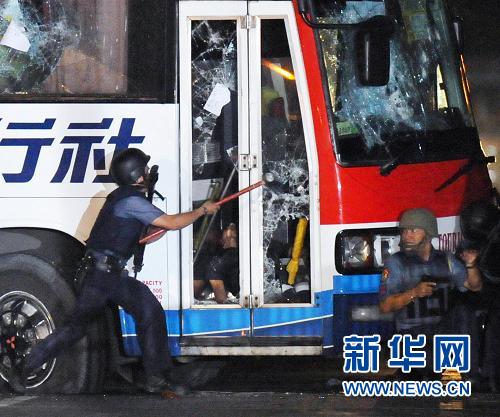 資料圖片:8月23日,在菲律賓馬尼拉,警察試圖打開被劫持旅游車的車門。新華社/法新
