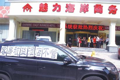 ????“在熱河路一家酒店門口,一輛車上貼著維權(quán)標語,你們快來看看吧?!毕挛?時,市民王先生向記者報料說。接到線索后,記者迅速趕到熱河路,老遠就看到一輛黑色商務(wù)車橫在魅力海岸商務(wù)酒店停車場,沖著熱河路的一邊貼著“客房被盜酒店不管”八個大字,旁邊站著兩名女士。
