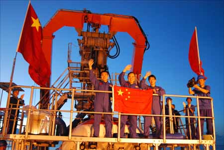 《國際先驅(qū)導報》特約撰稿費田發(fā)自北京 在母船“向陽紅9號”的后甲板上,中國首個深海載人潛水器“蛟龍?zhí)枴膘o躺待命。三名潛航員依次進入潛水器,經(jīng)過一段時間調(diào)試后,它以每分鐘37米的速度緩緩下潛。