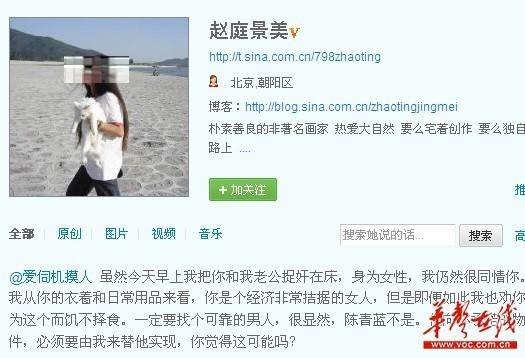 ????讓人瞠目結(jié)舌的是,不僅老婆擅用微博,老公一樣也是不忘在微博上表明立場。事發(fā)后,老公“北京陳青藍(lán)”很是“淡定”地連發(fā)幾條: