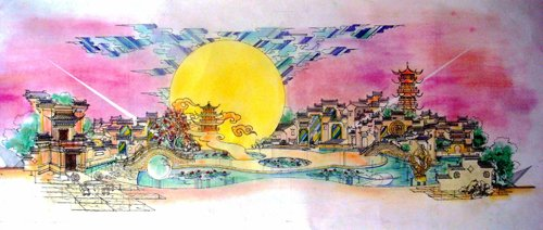 該效果圖宏大的美景躍然紙上,將中秋晚會(huì)的祥和氛圍展露無(wú)遺,尤其是高達(dá)20余米月亮通過(guò)多媒體影像的手法將皓月當(dāng)空的那種大氣感溫暖地散落在湖光山色之間。典雅大氣,給人一種和平盛世、國(guó)泰民安、其樂(lè)融融的景象。