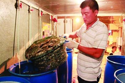 ????同樣,來(lái)自連云港的蟹販子鐘國(guó)粹也沒(méi)閑著,不停地往成筐的蟹子上灑水。“這么遠(yuǎn)運(yùn)過(guò)來(lái),怕蟹子死。”鐘國(guó)粹說(shuō),長(zhǎng)途運(yùn)輸?shù)男纷尤勘嗥饋?lái)保鮮,再放在大桶里用海水養(yǎng)著。鐘國(guó)粹說(shuō),一個(gè)大桶大約能裝170斤的蟹子,一輛較大集裝箱車一般能裝22個(gè)桶,而小的也能裝11個(gè)。 “今天南山的蟹子算多的,大概有65噸左右。 ”