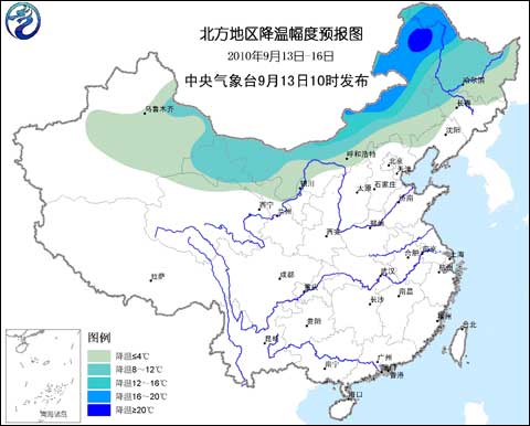 圖1 北方地區(qū)降溫幅度預(yù)報(bào)圖(2010年9月13日至16日)