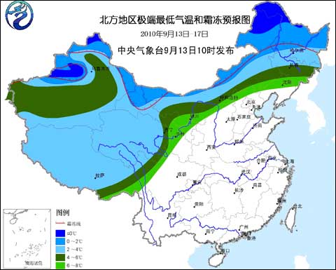圖2 北方地區(qū)極端最低氣溫和霜凍預(yù)報(bào)圖(2010年9月13日至17日)