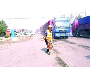 ????記者采訪時(shí)看到,穿過呼市北郊城郊結(jié)合部的110國道最危險(xiǎn)的是毫沁營這一段,東西長有近10公里,路面寬僅有6米,雙向行駛兩輛大車就把道占滿了。路上除與興安北路交匯的十字路口外,穿過市區(qū)的路上沒有看到值班的交警、紅綠燈、隔離帶和電子眼,加上每天幾千輛大車通過,使這里擁擠不堪,交通秩序十分混亂,一旦出現(xiàn)傷亡事故,肇事司機(jī)極易逃逸,在這種條件下,環(huán)衛(wèi)工出現(xiàn)傷亡的可能性也就遠(yuǎn)遠(yuǎn)超過市里的路面。