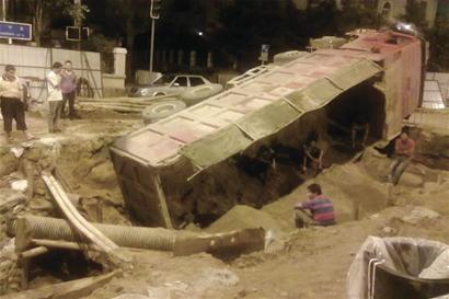 ????“當(dāng)時(shí)我開著車自西向東行駛,在駛過遼寧路和壽光路路口時(shí)可能太靠邊了。”在現(xiàn)場,自卸車司機(jī)稱,他稱,自卸車內(nèi)載著大概30噸細(xì)沙,加上自卸車自重也很大,駛過管道坑時(shí)好像將坑壁壓塌了,整輛車失去平衡側(cè)翻滑進(jìn)管道坑里,幸好車頭一直翹在上面,他等車停止滑行后從駕駛室爬出?!靶液卯?dāng)時(shí)夜已經(jīng)深了,坑下并沒有工人在施工,否則這么多細(xì)沙突然傾瀉而下,后果不堪設(shè)想?!爆F(xiàn)場施工的工人稱。 (記者 黃飛 于滈 攝影報(bào)道)
